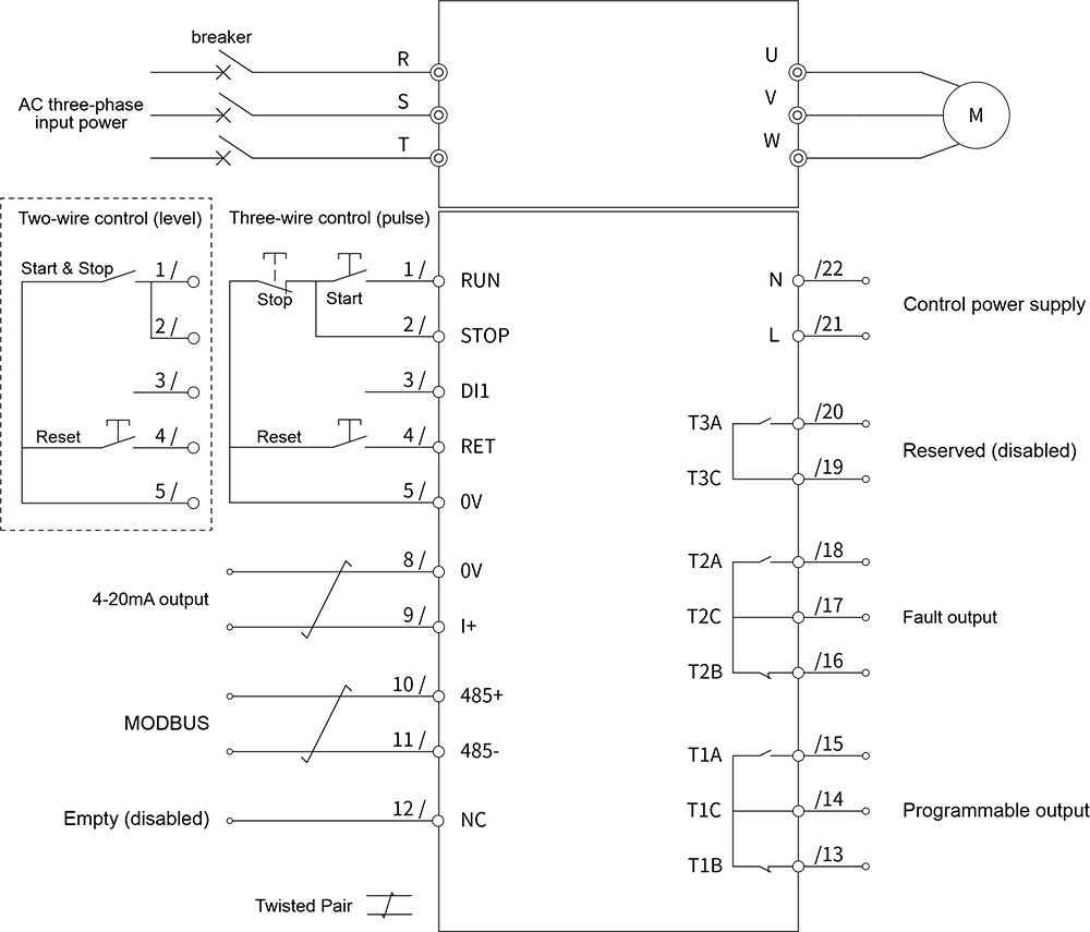 | | Itsenäinen ohjausvirtalähde (220VAC), parametrien asetus on mahdollista myös ilman virtalähdettä (380V) |