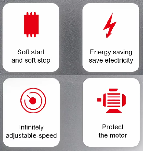 | Kiihtyvyys/hidastuskäyrä | Lineaarinen tai S-muotoinen kiihtyvyys ja hidastuminen: kolme kiihtyvyys- ja hidastusaikojen ryhmää: kiihdytys- ja hidastusaika-alue: 0-3200 s |