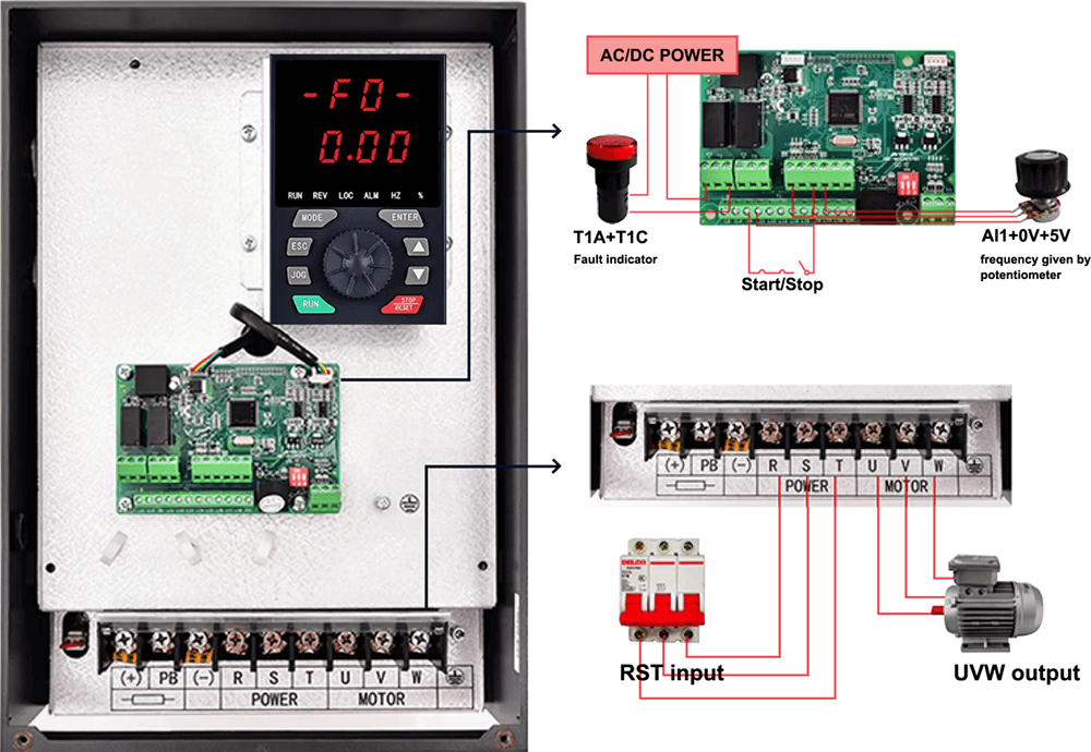 | Relelähtö | T1A, T1B, T1C T2A, T2B, T2C | T1A normaalisti auki, T1B normaalisti kiinni, T1C yhteinen piste T2A normaalisti auki, T2B normaalisti kiinni, T2C yhteinen piste Kosketinkapasiteetti: 5A@250VAC, 5A@30VDC Vika, hälytys, taajuuden saapuminen ja muut toiminnot ovat valinnaisia T1A on oletusarvoisesti vika, T2A toimii oletusarvoisesti 220V 0.4kW-2.2kW ja 380V 0.4kW-1.5kW tuotteissa on vain yksi relelähtö, eli TA TB TC |