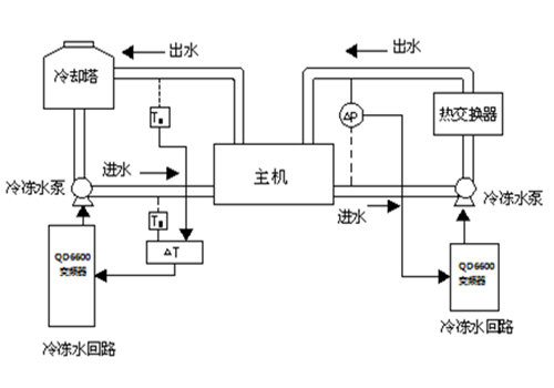 | 04 järjestelmän esittely: Tässä järjestelmässä kahta 110 kW:n jäähdytysvesipumppua käyttää kaksi D71 110 kW:n invertteriä, ja on myös useita D71-inverttereitä, jotka käyttävät puhaltimia (mukaan lukien sisätuulettimet ja jäähdytystornipuhaltimet). Jäähdytysveden kiertojärjestelmässä veden tulopiirin signaali 1 (lämpötilasignaali tai painesignaali) ja vedenpoistopiirin signaali 2 (lämpötilasignaali tai painesignaali) lähetetään analogiseen moduuliin invertterin analogisen takaisinkytkentäsignaalin saamiseksi. Invertterin sisäänrakennetun PID-toiminnon avulla toteutetaan suljetun silmukan automaattinen ohjaus. | | ||||||||||||||||||